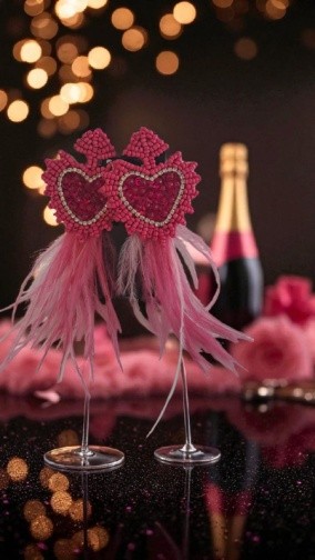 Aros Venecia fuccia. Bordados con lentejuelas, mostacillas, cuentas, estrás y plumas, sobre paño lenci y cuerina, terminados con acrílico. $26.500