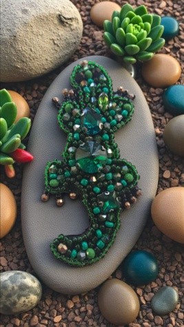 Prendedor jacaré, bordado con cristales, mostacillas, cuentas y estrás sobre paño lenci.